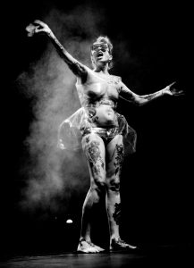 Um corpo se encontra instalado num canto, sala, palco ou galeria, vazando palavras apocalípticas tropicais. É presença exposta e atravessada por estilhaços do caos contemporâneo. A performance se configura como um ato radical quando utiliza as artes cênicas como denúncia do violento mundo em que vivemos, revelando o caos como sintoma. Propõe uma política do corpo como resistência em benefício da vida.