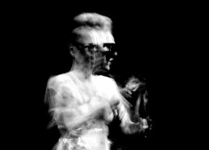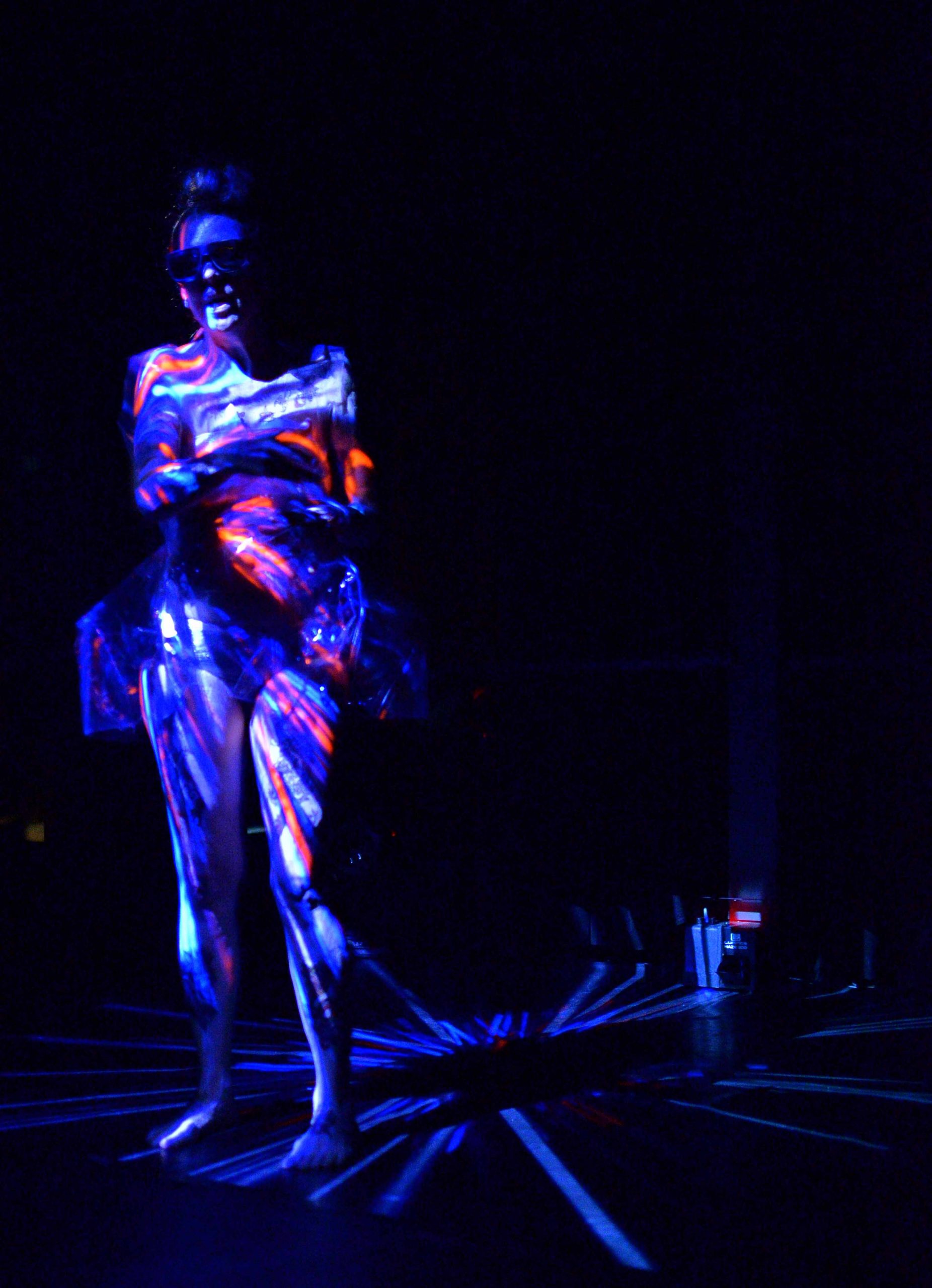 Na cena um corpo fabula ou hiper fabula, procurando experimentar o caos em uma organização radical e inusitada, e assim, afetar o público. A ideia de caos se dá pela organização ou (des) organização (uma vez que os “erros” são bem-vindos), através de sobreposição dissociada do recurso da voz em contraposição aos movimentos. Esse corpo fala/vaza de forma leve e automática buscando velocidade e fluxo contínuo na emissão do texto, que se contrapõe com o mover também contínuo, porém, sempre interrompido por contrações em diferentes velocidades. A movimentação, numa estrutura composta para improviso, varia entre gestos cotidianos de fala/conversa, postura e gestos “elegantes ou sedutores”, gestos característicos da cultura pop e danças sociais/populares. Utiliza-se a técnica do Popping uma das vertentes do Hip Hop, como disparador do estado corporal, sem a intensão de ser uma apresentação de Hip Hop ou de Danças Urbanas. Em HT três velocidades de contração e relaxamento estão organizadas: Pop (lenta), Strobing (média) e Hitting (rápida). O fluxo gestual e de danças da movimentação quando interrompido, persegue uma ideia de anti-fluxo de movimento, aqui coerente com a ideia de caos.